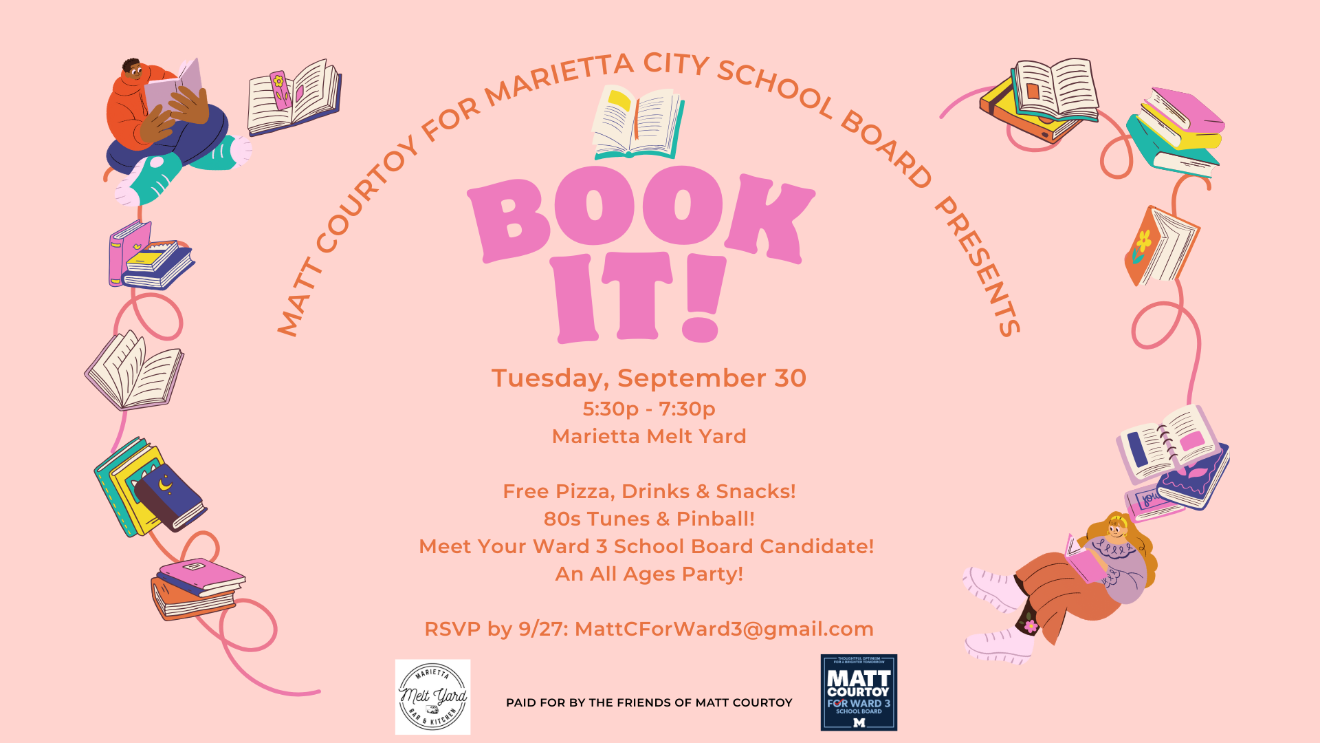 Join me for BOOK IT!, an all ages event on Tuesday, September 30 from 5:30p - 7:30p at Marietta Melt Yard!